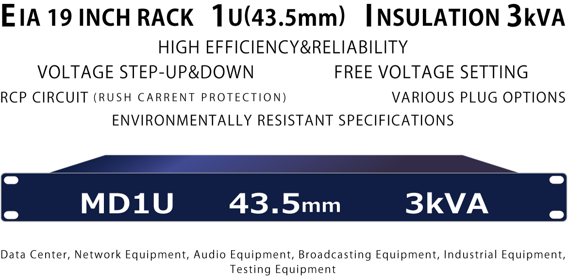 - 19インチラック最小スペース 1Uサイズ(43.5mm)で~3kVA(100V 30A/200V 15A)まで選定可能。40年以上の製作実績を誇る超薄型シリーズ(MHモデル)をベースに、1Uサイズ専用に設計したアイソレーショントランスを内蔵することにより、電源系から接続機器を電気的に分離し、高信頼性が要求されるシステムにおいてノイズ誤動作の抑止にも役立ちます。